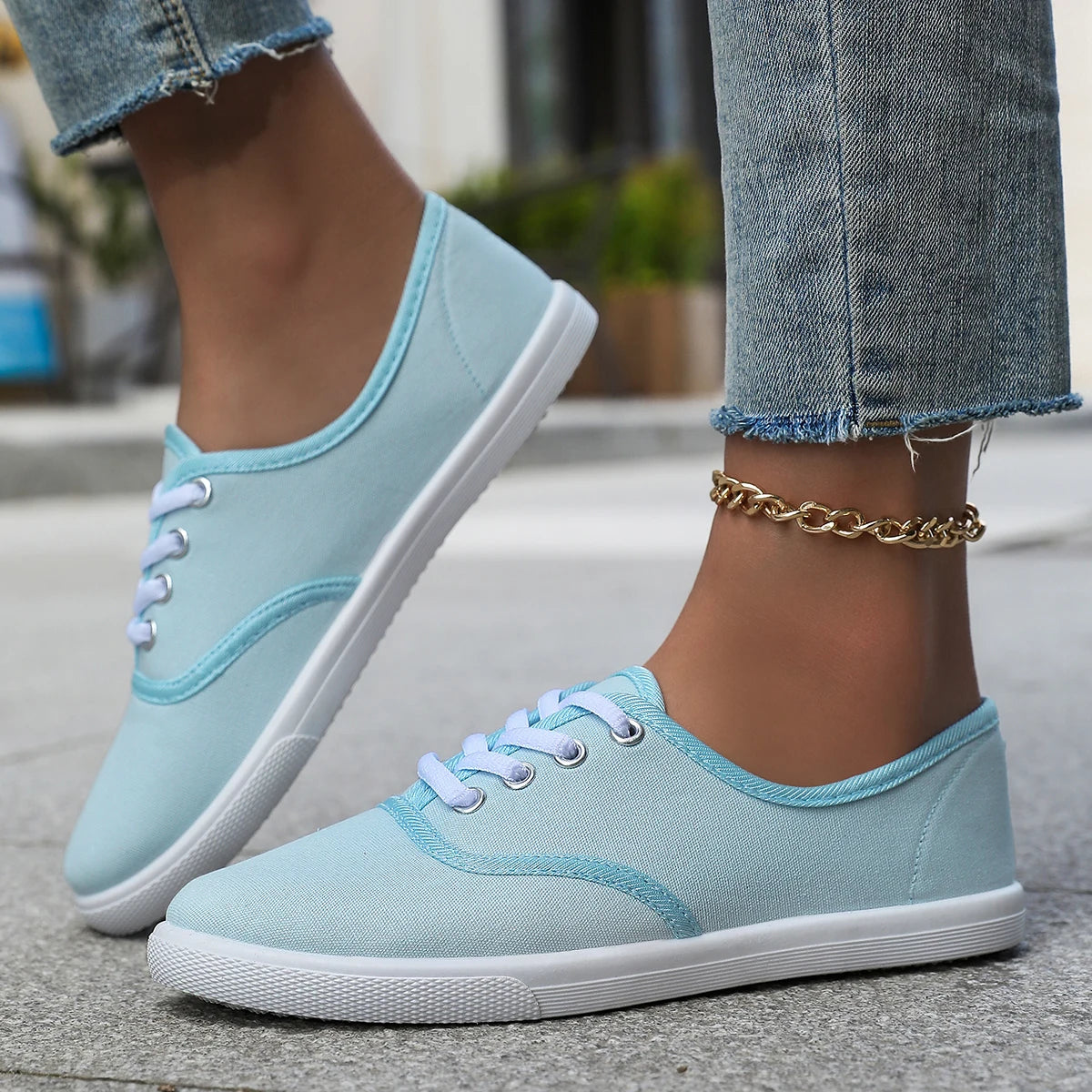 Step into effortless style with our Canvas Charm sneakers, designed for the modern woman on the go. These lightweight, lace-up shoes offer a classic look with a contemporary edge, perfect for casual outings or campus strolls. The breathable canvas upper and comfortable cotton lining make them ideal for all-day wear, while the durable rubber outsole ensures stability and grip. Elevate your wardrobe with these versatile flat walking shoes that blend simplicity and comfort seamlessly.