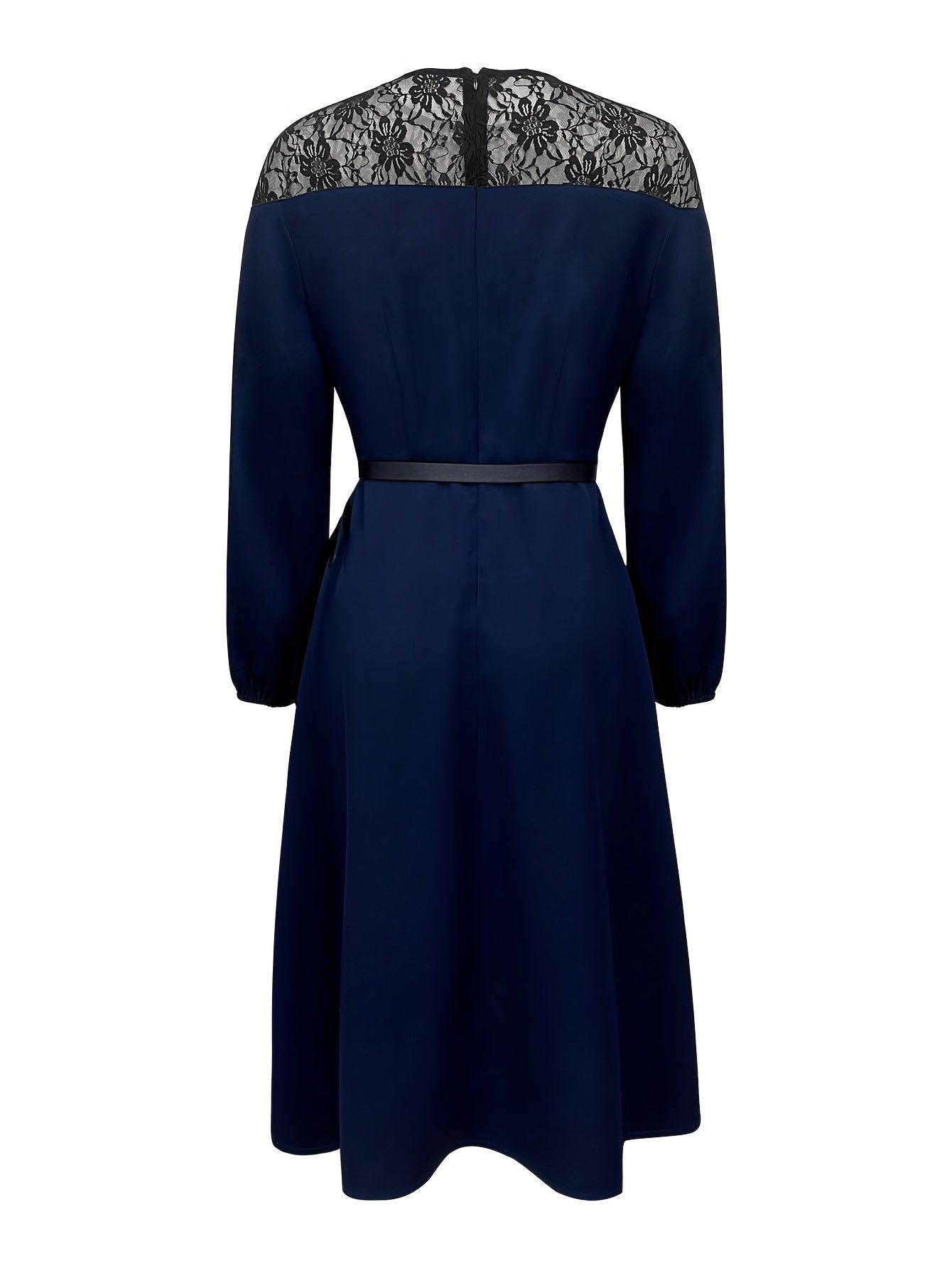 Elegant Lace-Trimmed Long Sleeve Dress with Belt