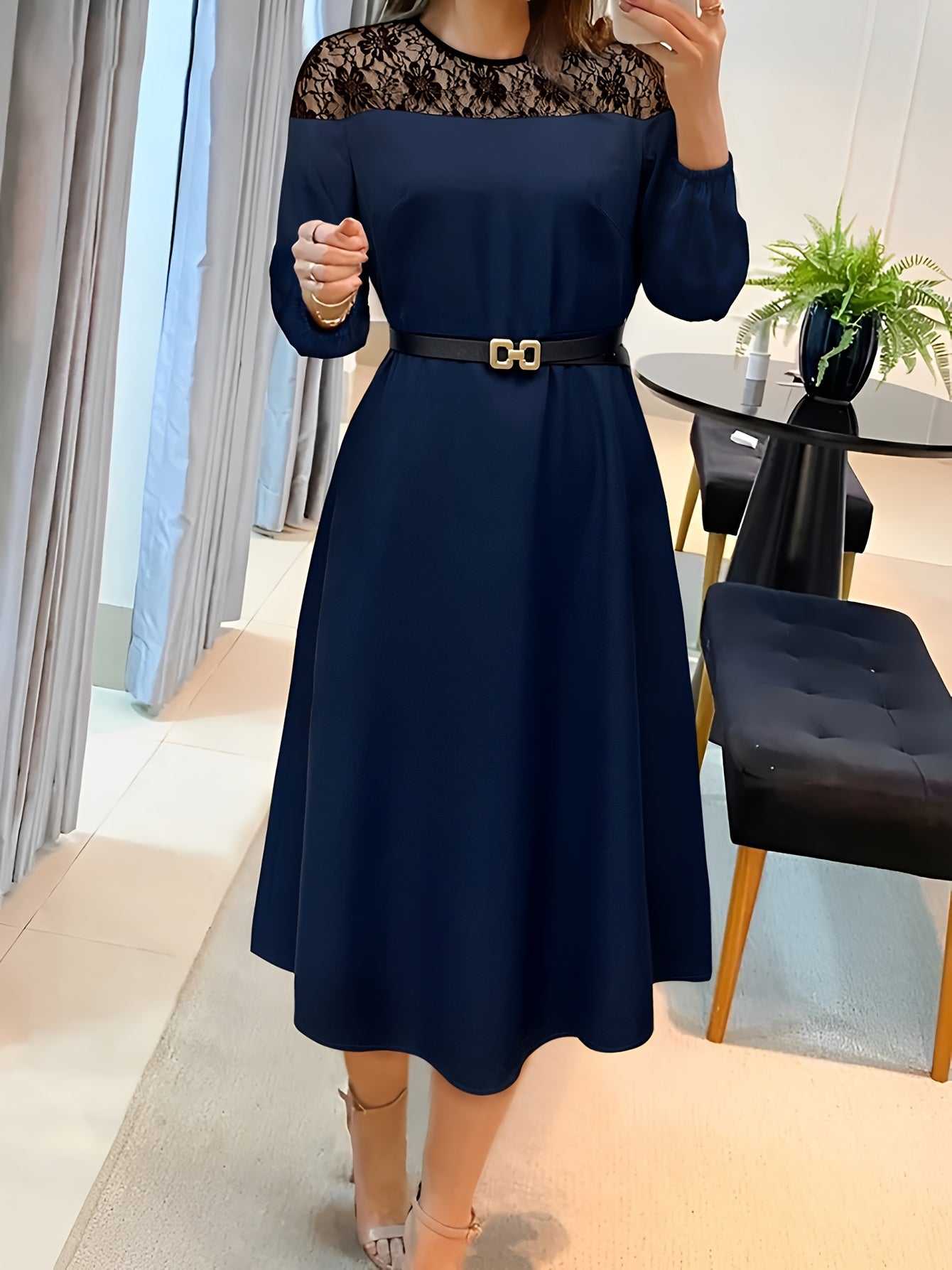 Refined and timeless, this Elegant Lace-Trimmed Long Sleeve Dress is a must-have for spring and autumn wardrobes. Designed with delicate contrast lace detailing, a flattering A-line silhouette, and a crew neck, it effortlessly blends sophistication with comfort. The included belt cinches the waist, enhancing your natural shape.