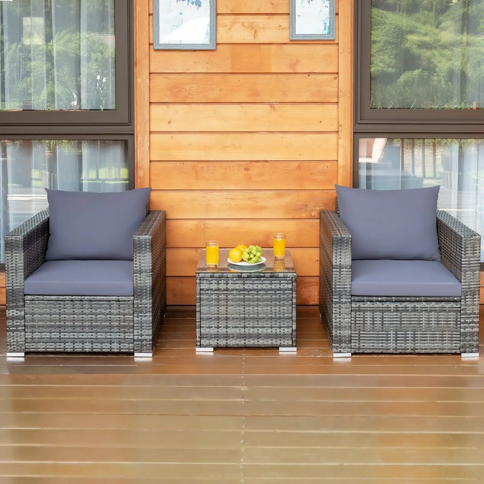 Create a cosy and stylish outdoor retreat with the GOFLAME 3-Piece Wicker Patio Set, designed for comfort, durability, and modern aesthetics. This all-weather PE rattan set includes two deep-seated chairs, a tempered glass coffee table, and plush cushions, making it perfect for relaxing in your garden, patio, poolside, or balcony.