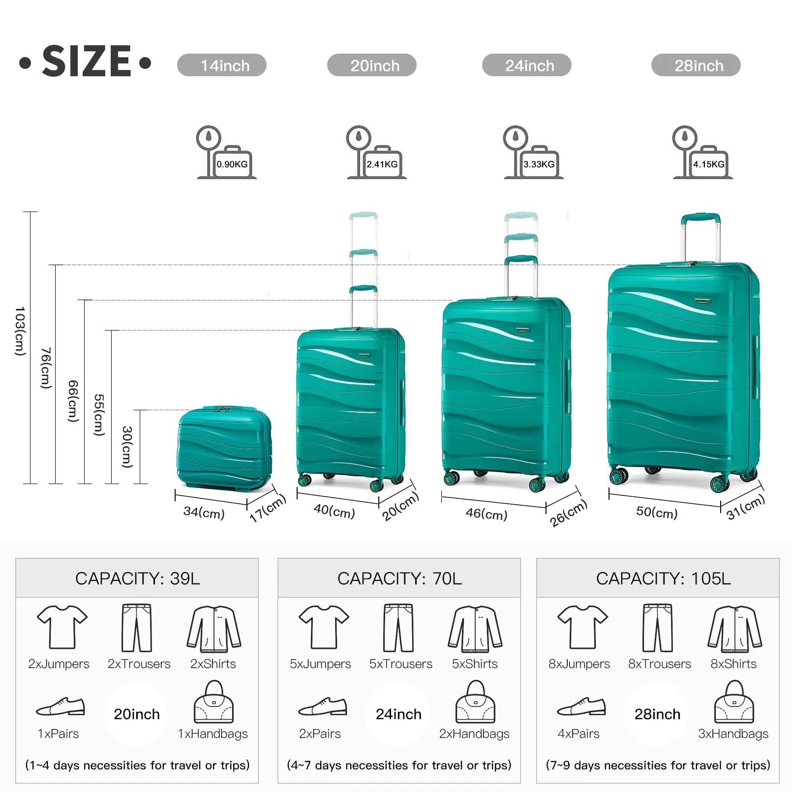 4-Piece Nesting Set – Includes 14", 20", 24", and 28" sizes for all your travel needs, with easy nesting for compact storage.