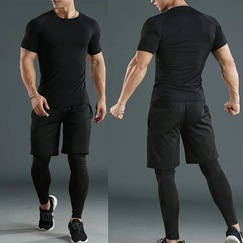 Enhance your workout performance with this Men’s 3-Piece Compression Set, designed for fitness, running, gym training, and outdoor sports. This set includes a short sleeve compression shirt, leggings, and running shorts, offering maximum support, flexibility, and breathability for an ultimate training experience.